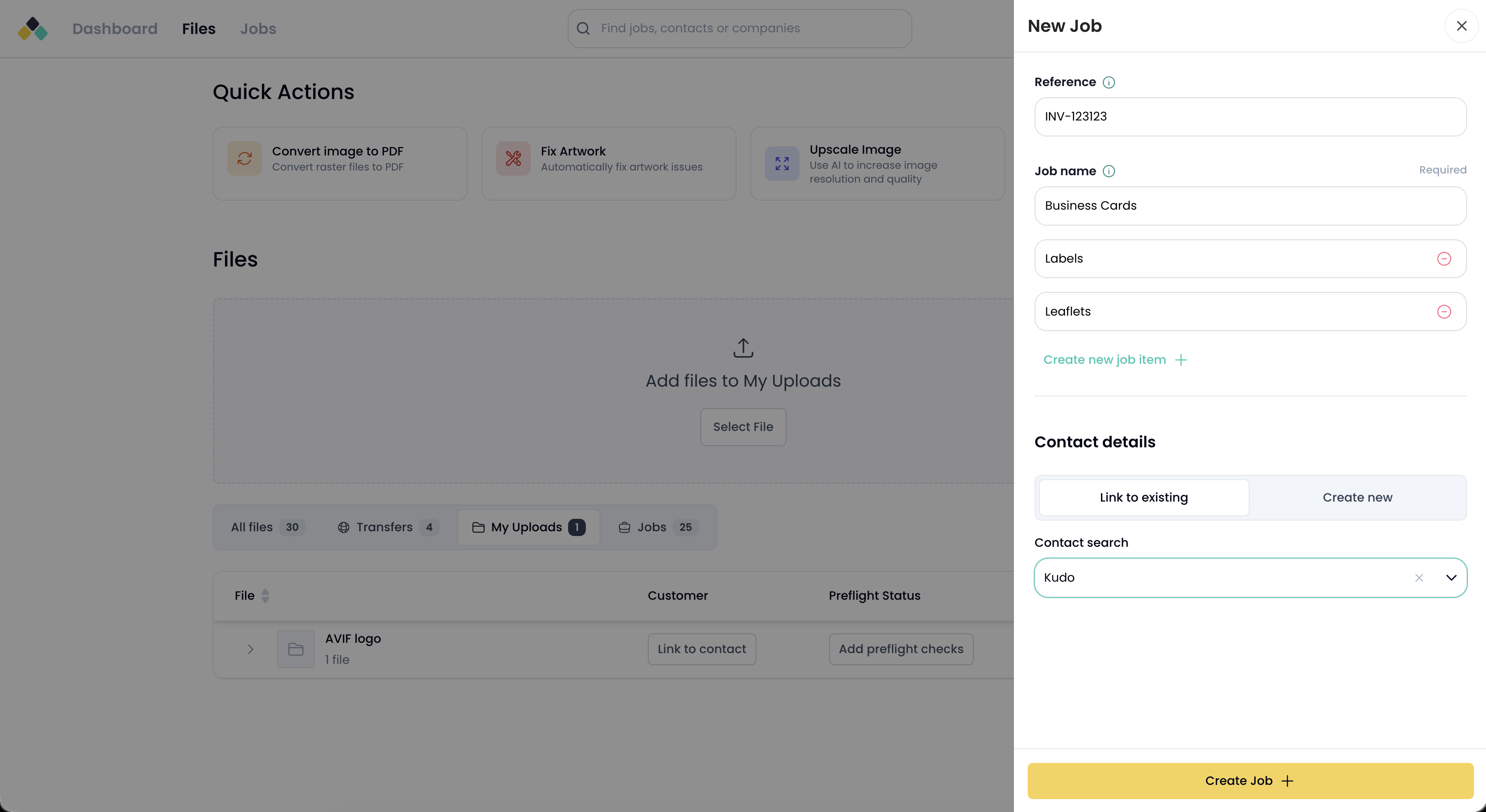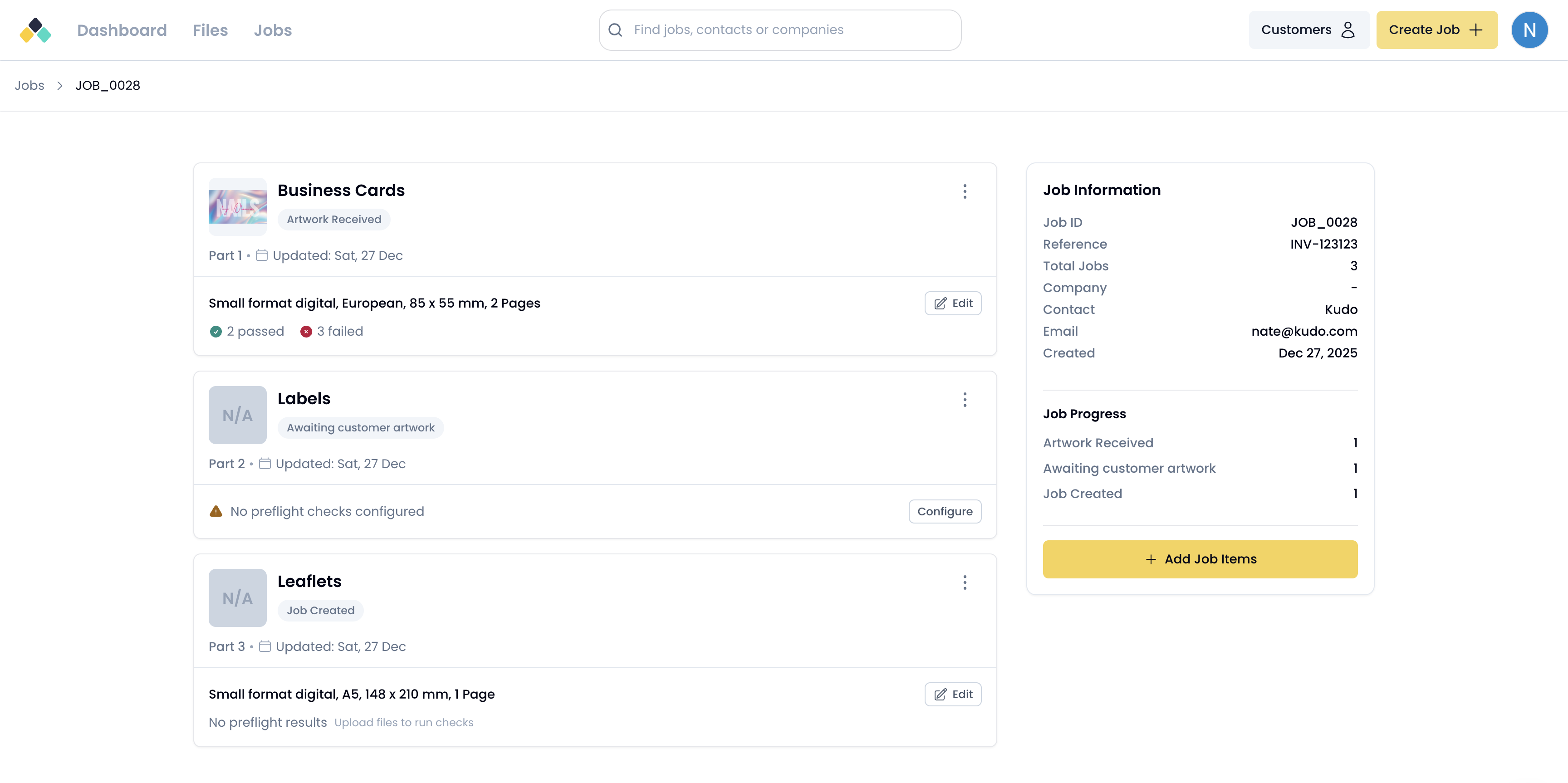A single job can contain multiple job items, allowing multi-product orders to be managed together under one reference. For example, a job may contain separate job items for posters, leaflets and labels.