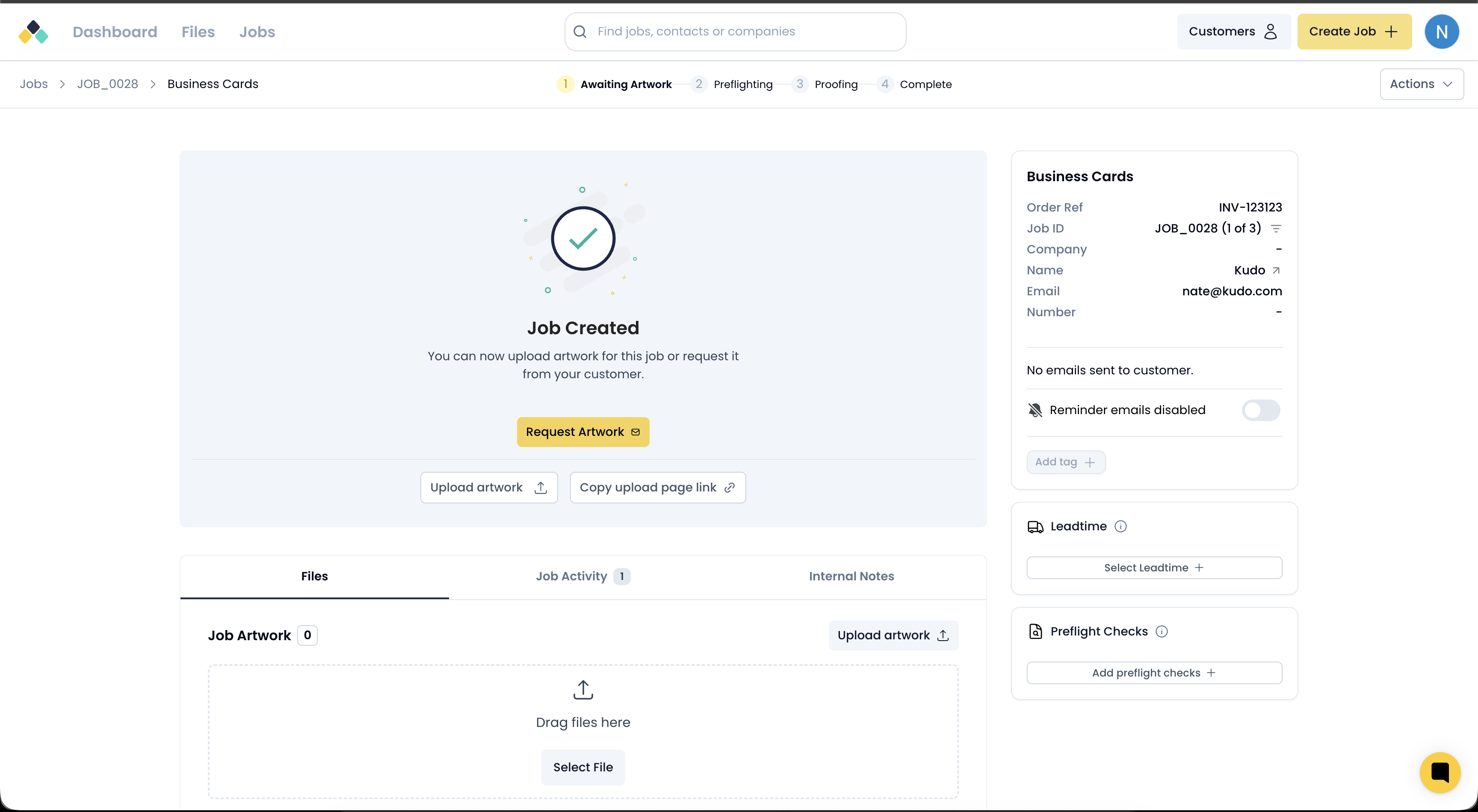 Jobs do not carry artwork directly. All artwork and production activity is handled at the job item level.